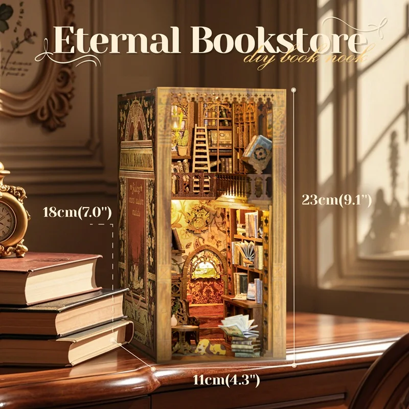 The Eternal Bookstore Book Nook is a detailed DIY miniature kit designed for builders who appreciate classic library aesthetics and multi-level architectural scenes. With 172 precision-cut pieces and an estimated 20-hour assembly time, this project offers a rewarding build and an impressive final display for any bookshelf.