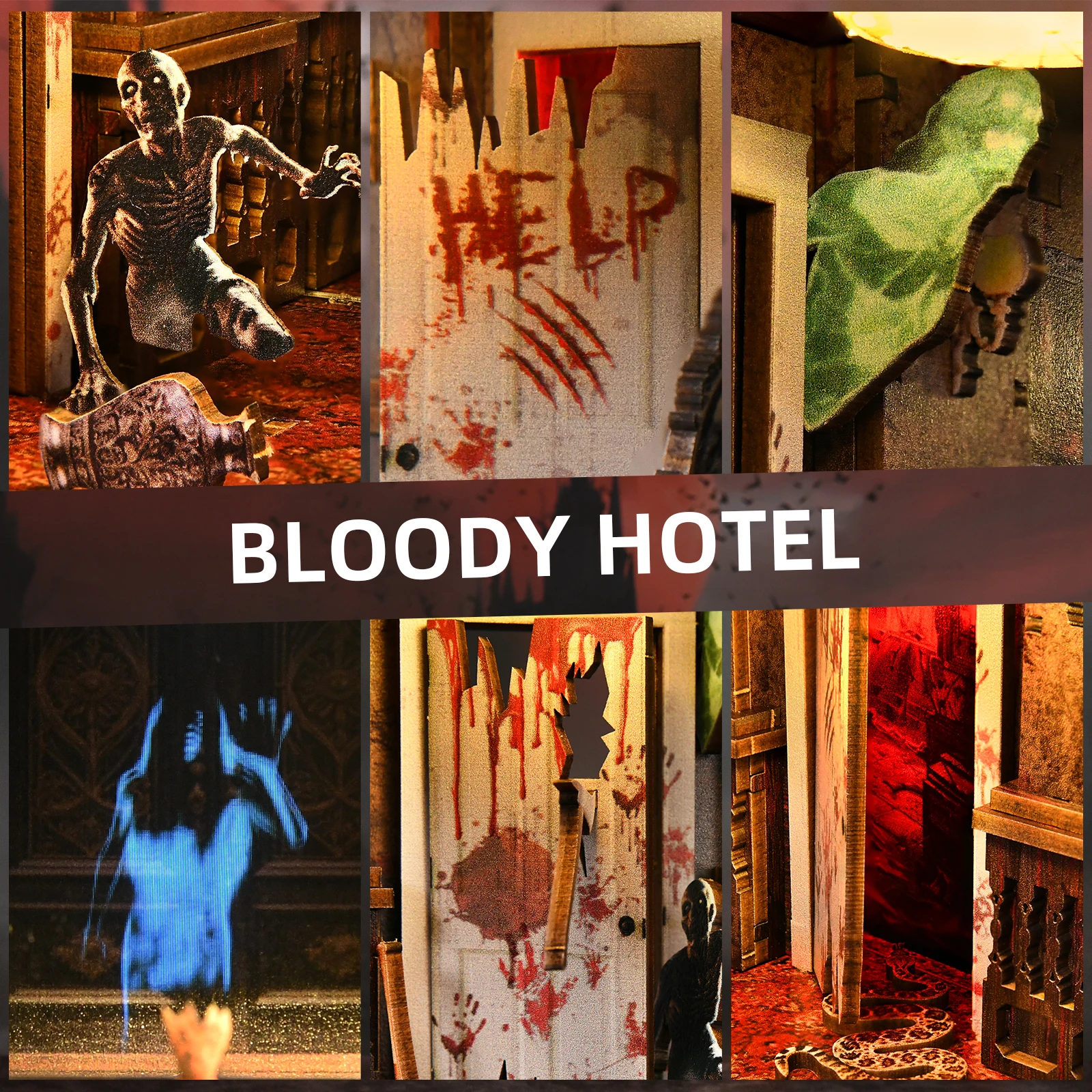 This kit includes pre-cut pieces that assemble into a miniature hotel filled with spooky details, lighting, sound effects, and a small display screen for added atmosphere.