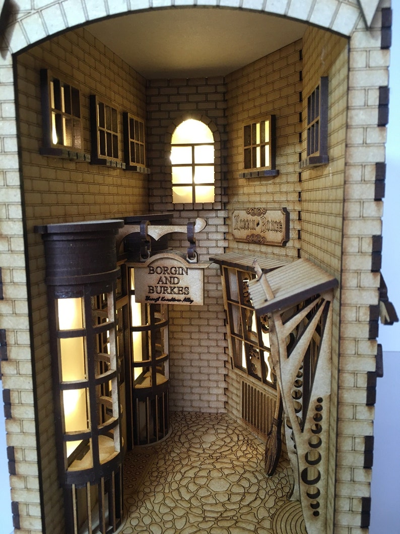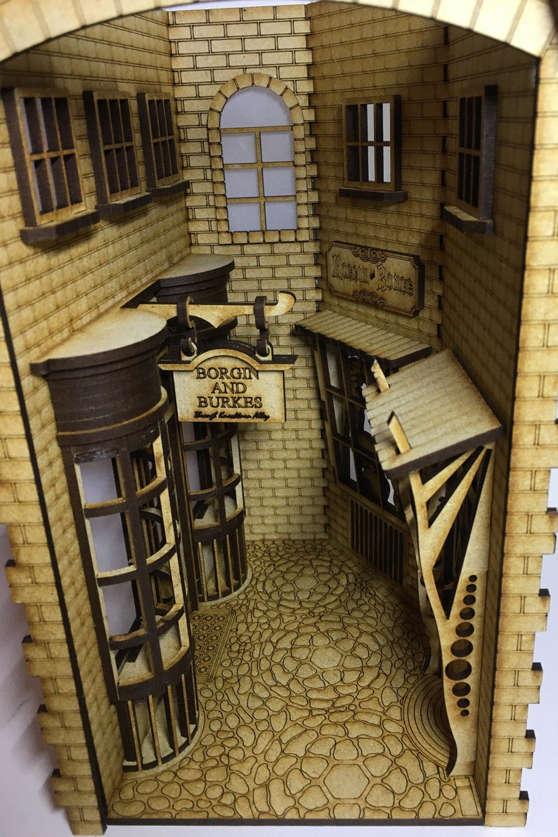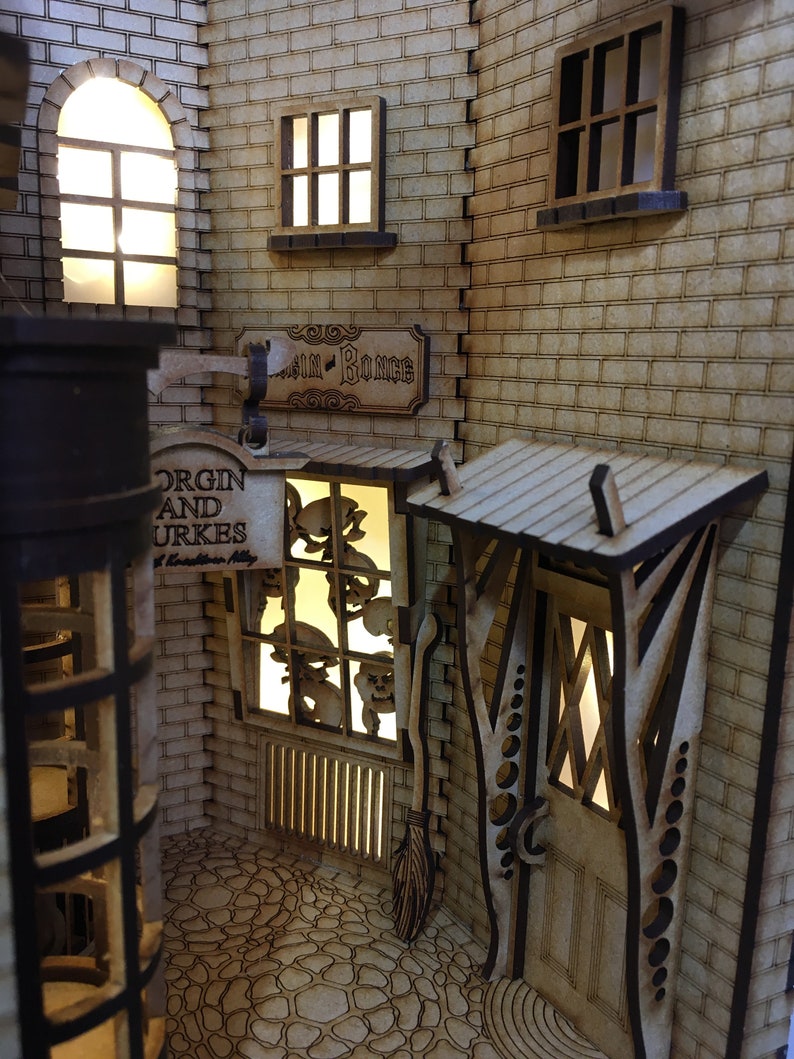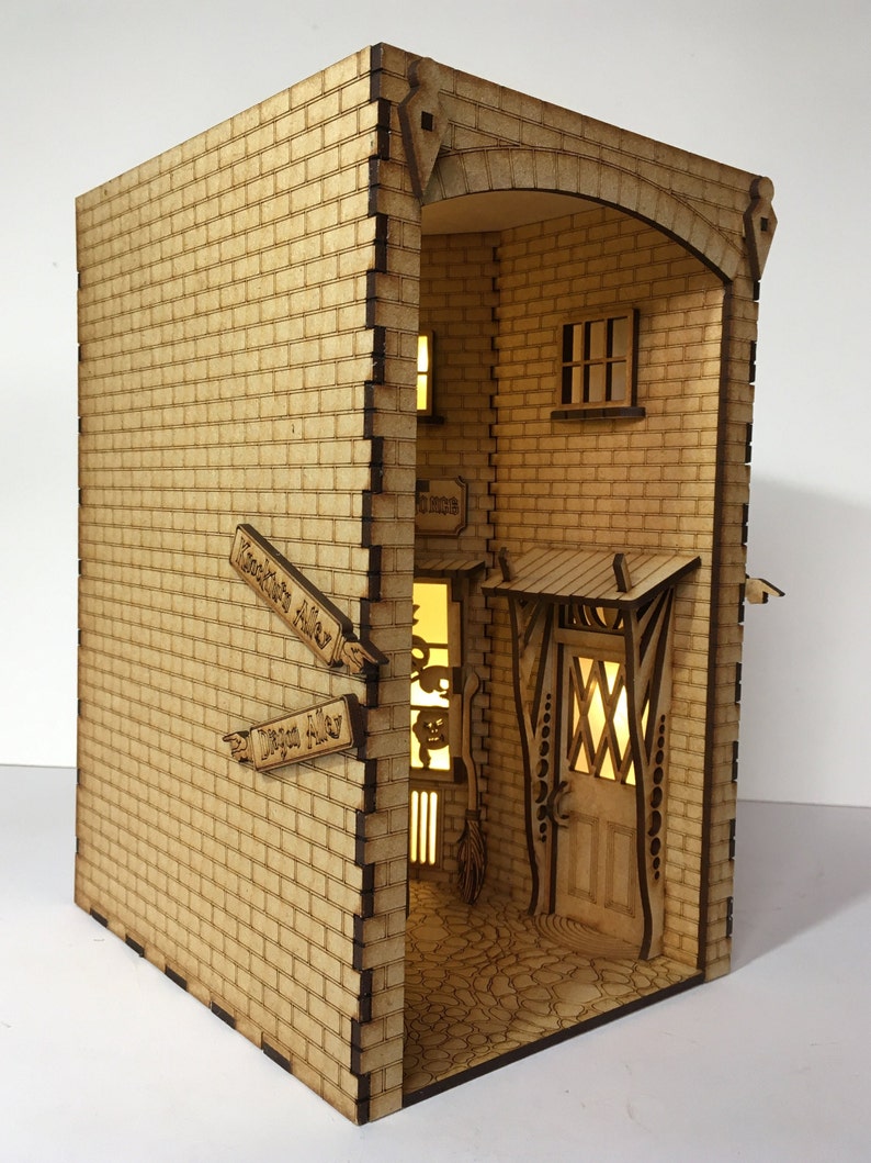 Bring one of the wizarding world’s most mysterious streets to life with the Knockturn Alley Book Nook Kit. This DIY set includes precision-cut 3mm MDF parts, ready to paint and assemble into a detailed miniature alley scene. Every component is designed for easy construction, smooth lighting installation, and a realistic finished look.