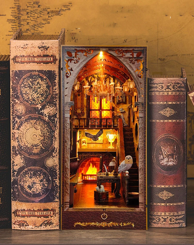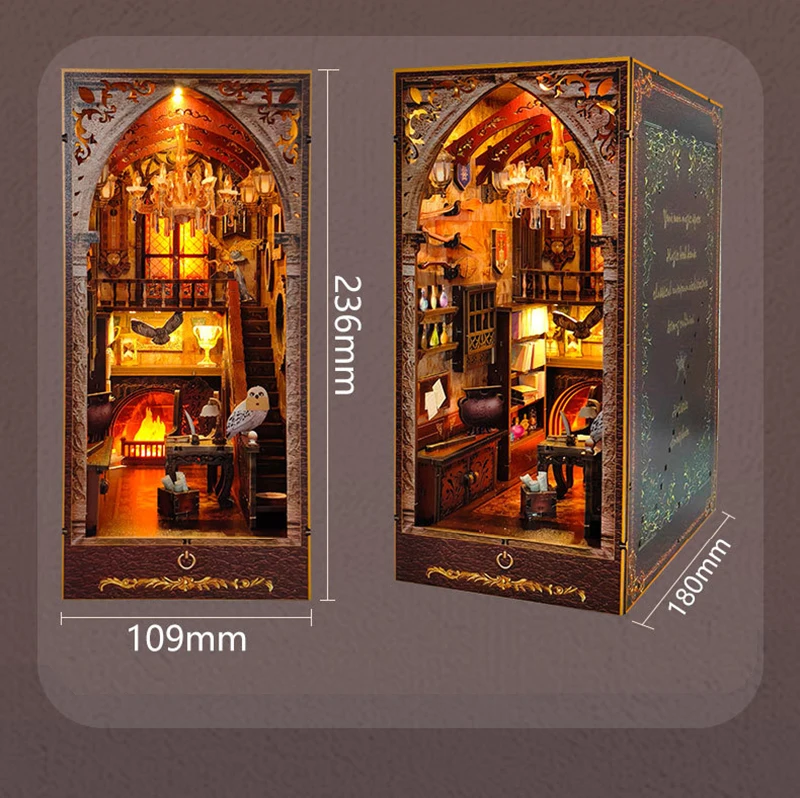 Create your own miniature “Magic Academy” scene with this detailed DIY wooden book nook kit. Designed for hobbyists and collectors, this buildable model includes furniture pieces, props, and structural components that come together to form an immersive bookshelf insert. Each part is crafted from high-quality materials including wood, fabric, paper, resin, plastic, and metal, offering a realistic and sturdy result.