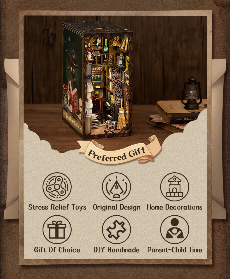 The Magic Pharmacist Book Nook is a detailed DIY miniature kit designed for builders who enjoy fantasy-themed scenes and intricate crafting. With 282 pieces and an estimated 15-hour assembly time, this project brings a magical apothecary to life through potions, spell books, unique props, and warm lighting effects.